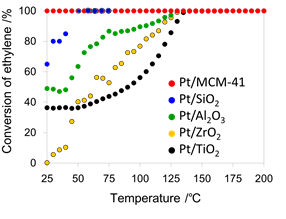 各種触媒を用いてエチレンの酸化反応を検討したところ、Pt/Al2O3、Pt/TiO2、Pt/ZrO2は125 oC以下でエチレン転化率が低下しましたが、Pt/SiO2は他の触媒に比べて低温領域でも高いエチレン転化率を示しました(図3)。しかし、25 oCにおいてエチレンの完全分解が可能だったのはPt/MCM-41だけでした。また、Pt/MCM-41ではエチレンの炭素はすべてCO2になり、炭素バランスが100%であることも確認しました。