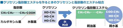 食品用乳化剤は、脂肪酸のカルボキシル基と多価アルコールの水酸基がエステル結合しています。