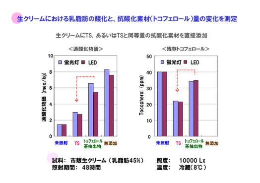 乳製品中では光照射下においてビタミンB2が光増感酸化を引き起こし、乳脂肪や乳タンパク質が著しく劣化しますが、スーパーエマルジョンTSシリーズの添加によりこれらの酸化劣化を効果的に抑制します。