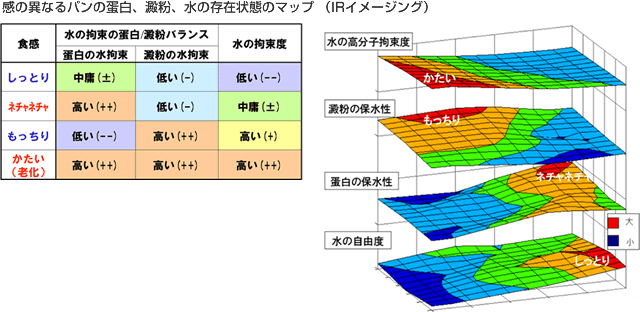 下図は食感の異なるパン14種類の蛋白質、澱粉、水の存在状態をIRイメージングの分析結果より得られたマップで、下表に示すように、蛋白質と澱粉の水拘束度合が、パンの食感に大きく影響すると考えられました。